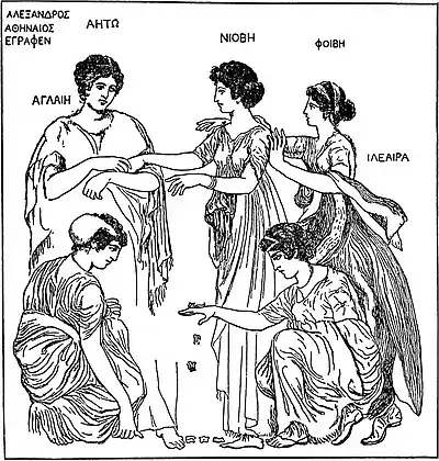 But very few actual paintings of the age survive, and even these fragmentary remains have with time lost the freshness of their colouring; nor are they in any case the work of a noteworthy hand. We reproduce two examples. The first is from a stone of the vault of a Crimean grave (Plate IV. fig. 67). The date of the grave is fixed to the 4th century by ornaments found in it, among which was a gold coin of Alexander the Great. The representation is probably of Demeter or her priestess, her hair bound with poppies and other flowers. The original is of large size. The other illustration (fig. 42) represents the remains of a drawing on marble, representing a group of women playing knucklebones. It was found at Herculaneum. Though signed by one Alexander of Athens, who was probably a worker of the Roman age, Professor Robert is right in maintaining that Alexander only copied a design of the age of Zeuxis and Parrhasius. In fact the drawing and grouping is so closely like that of reliefs of about 400 B.C. that the drawing is of great historic value, though there be no colouring. Several other drawings of the same class have been found at Herculaneum, and on the walls of the Transtiberine Villa at Rome (now in the Terme Museum).