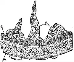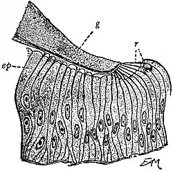 | Fig. 5.—Part of a section through the apparatus of fixation of a Pterocephalus, showing root-like processes extending from the Gregarine between the epithelial cells. g, Head of Gregarine; r, Root-like processes; ep, Epithelial cells. |
