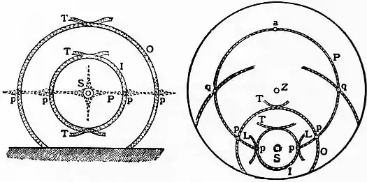 The phenomenon of a solar (or lunar) halo as seen from the earth is represented in fig. 1; fig. 2 is a diagrammatic sketch showing the appearance as viewed from the zenith; but it is only in exceptional circumstances that all the parts are seen. Encircling the sun or moon (S), there are two circles, known as the inner halo I, and the outer halo O, having radii of about 22° and 46°, and exhibiting the colours of the spectrum in a confused manner, the only decided tint being the red on the inside. Passing through the luminary and parallel to the horizon, there is a white luminous circle, the parhelic circle (P), on which a number of images of the luminary appear. The most brilliant are situated at the intersections of the inner halo and the parhelic circle; these are known as parhelia (denoted by the letter p in the figures) (from the Gr. παρά, beside, and ἥλιος, the sun) or “mock-suns,” in the case of the sun, and as paraselenae (from παρά and σελήνη, the moon) or “mock-moons,” in the case of the moon. Less brilliant are the parhelia of the outer halo. The parhelia are most brilliant when the sun is near the horizon. As the sun rises, they pass a little beyond the halo and exhibit flaming tails. The other images on the parhelic circle are the paranthelia (q) and the anthelion (a) (from the Greek ἀντί, opposite, and ἥλιος, the sun). The former are situated at from 90° to 140° from the sun; the latter is a white patch of light situated at the anti-solar point and often exceeding in size the apparent diameter of the luminary. A vertical circle passing through the sun may also be seen. From the parhelia of the inner halo two oblique curves (L) proceed. These are known as the “arcs of Lowitz,” having been first described in 1794 by Johann Tobias Lowitz (1757–1804). Luminous arcs (T), tangential to the upper and lower parts of each halo, also occur, and in the case of the inner halo, the arcs may be prolonged to form a quasi-elliptic halo.
