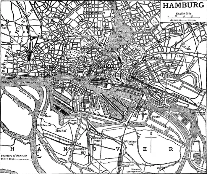 The old town lies low, and it is traversed by a great number of narrow canals or “fleets” (Fleeten)—for the same word which has left its trace in London nomenclature is used in the Low German city—which add considerably to the picturesqueness of the meaner quarters, and serve as convenient channels for the transport of goods. They generally form what may be called the back streets, and they are bordered by warehouses, cellars and the lower class of dwelling-houses. As they are subject to the ebb and flow of the Elbe, at certain times they run almost dry. As soon as the telegram at Cuxhaven announces high tide three shots are fired from the harbour to warn the inhabitants of the “fleets”; and if the progress of the tide up the river gives indication of danger, another three shots follow. The “fleets” with their quaint medieval warehouses, which come sheer down to the water, and are navigated by barges, have gained for Hamburg the name of “Northern Venice.” They are, however, though antique and interesting, somewhat dismal and unsavoury. In fine contrast to them is the bright appearance of the Binnen Alster, which is enclosed on three sides by handsome rows of buildings, the Alsterdamm in the east, the Alter Jungfernstieg in the south, and the Neuer Jungfernstieg in the west, while it is separated from the Aussen Alster by part of the rampart gardens traversed by the railway uniting Hamburg with Altona and crossing the lakes by a beautiful bridge—the Lombards-Brücke. Around the outer lake are grouped the suburbs Harvestehude and Pösseldorf on the western shore, and Uhlenhorst on the eastern, with park-like promenades and villas surrounded by well-kept gardens. Along the southern end of the Binnen Alster runs the Jungfernstieg with fine shops, hotels and restaurants facing the water. A fleet of shallow-draught screw steamers provides a favourite means of communication between the business centre of the city and the outlying colonies of villas.