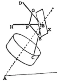 Many forms of heliostats have been devised, the earliest having been described by Wilhelm Jacob s’Gravesande in the 3rd edition of his Physices elementa (1742). One of the simplest consists of a plane mirror rigidly connected with a revolving axis so that the angle between the normal to the mirror and the axis of the instrument equals half the sun’s polar distance, the mirror being adjusted so that the normal has the same right ascension as the sun. It is easily seen that if the mirror be rotated at the same angular velocity as the sun the right ascensions will remain equal throughout the day, and therefore this device reflects the rays in the direction of the earth’s axis; a second fixed mirror reflects them in any other fixed direction. Foucault’s heliostat reflects the rays horizontally in any required direction. The principle of the apparatus may be explained by reference to fig. 1. The axis of rotation AB bears a rigidly attached rod DBC inclined to it at an angle equal to the sun’s polar distance. By adjusting the right ascension of the plane ABC and rotating the axis with the angular velocity of the sun, it follows that BC will be the direction of the solar rays throughout the day. X is the mirror rotating about the point E, and placed so that (if EB is the horizontal direction in which the rays are to be reflected) (1) the normal CE to the mirror is jointed to BC at C and is equal in length to BE, (2) the rod DBC passes through a slot in a rod ED fixed to, and in the plane of, the mirror. Since CE equals BE these directions are equally inclined to, and coplanar with, the normal to the mirror. Hence light incident along the direction BC will be reflected along CE. Silbermann’s heliostat reflects the rays in any direction. The principle may be explained by means of fig. 2. AB is the axis of rotation, BC an adjustable rod as in Foucault’s construction, and BD is another rod which can be set to the direction in which the rays are to be reflected. The rods BC and DB carry two small rods EF, GF jointed at F; at this joint there is a pin which slides in a slot on the rod BH, which is normal to the mirror X. The rods EF, GF are such that BEFG is a rhombus. It is easy to show that rays falling on the mirror in the direction BC will be reflected along BD. One construction of the instrument, described in Jamin’s Cours de physique, is shown in fig. 3. The mirror mm is attached to the framework pafe, the members of which are parallel to the incident and reflected rays SO, OR, and the diagonal pf is perpendicular to the mirror. The framework is attached to two independent circular arcs Cs and r r ′ having their centres at O and provided with clamps D and A on the axis F of the instrument. The arc Cs is graduated, and is set so that the angle COD equals the complement of the sun’s declination. This can be effected (after setting the axis) by rotating Cs until a needle indicates true time on the hour dial B. The arc r r ′ is set so as to reflect the rays in the required direction. The axis F of the instrument is set at an angle equal to the latitude of the place of observation and in the meridian by means of the screw K, and rotated by clockwork contained in the barrel H. The setting in the meridian is effected by turning the instrument after setting for latitude until a pin-hole aperture s and a small screen P, placed so that Ps is parallel to CO, are in a line with the sun.