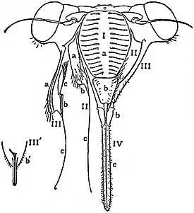 | Fig. 2.—Head of Cicad, front view. Ia, frons; b, clypeus (the pointed labrum beneath it); II, mandible; III, first maxilla; (a, base; b, sheath; c, piercer), III′, inner view of sheath; IV, second maxillae forming rostrum (b, mentum; c, ligula). |