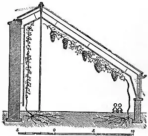 The Vinery is a house devoted to the culture of the grape-vine, which is by far the most important exotic fruit cultivated in English gardens. When forming part of a range a vinery would in most cases be a lean-to structure, with a sharp pitch (45-50°) if intended for early forcing, and a flatter roof (40°) with longer rafters if designed for the main and late crops. (1) The lean-to (fig. 5) is the simplest form, often erected against some existing wall, and the best for early forcing, being warmer on account of the shelter afforded by the back wall. In this house the principal part of the roof is a fixture, ventilation being provided for by small lifting sashes against the back wall, and by the upright front sashes being hung on a pivot so as to swing outwards on the lower side. The necessary heat is provided by four 4-in. hot-water pipes, which would perhaps be best placed if all laid side by side, while the vines are planted in front and trained upwards under the roof. A second set of vines may be planted against the back wall, and will thrive there until the shade of the roof becomes too dense. (2) The hip-roofed or three-quarter span (fig. 6) is a combination of the lean-to and the span-roofed, uniting to a great degree the advantages of both, being warmer than the span and lighter than the lean-to. The heating and ventilating arrangements are much the same as in the lean-to, only the top sashes which open are on the back slope, and therefore do not interfere so much with the vines on the front slope. In both this and the lean-to the aspect should be as nearly due south as possible. Houses of this form are excellent for general purposes, and they are well adapted both for muscats, which require a high temperature, and for late-keeping grapes. (3) The span-roofed (fig. 7), the most elegant and ornamental form, is especially adapted for isolated positions; indeed, no other form affords so much roof space for the development of the vines. The amount of light admitted being very great, these houses answer well for general purposes and for the main crop. The large amount of glass or cooling surface, however, makes it more difficult to keep up a high and regular temperature in them, and from this cause they are not so well adapted for very early or very late crops. They are best, nevertheless, when grapes and ornamental plants are grown in the same house, except, indeed, in very wet and cold districts, where, in consequence of its greater warmth, the lean-to is to be preferred. This type of house, cheaply constructed, is in general use for raising grapes for market.
