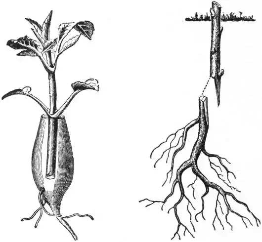 Root-grafting is sometimes resorted to where extensive increase is an object, or where stem-grafting or other means of propagation are not available. In this case the scion is grafted directly on to a portion of the root of some appropriate stock, both graft and stock being usually very small; the grafted root is then potted so as to cover the point of junction with the soil, and is plunged in the bed of the propagating house, where it gets the slight stimulus of a gentle bottom heat. Dahlias (fig. 19), paeonies, and Wistarias may be grafted by inserting young shoots into the neck of one of the fleshy roots of each kind respectively—the best method of doing so being to cut a triangular section near the upper end of the root, just large enough to admit the young shoot when slightly pared away on two sides to give it a similar form. In the case of large woody plants thus worked (fig. 20) the grafted roots, after the operation is completed, are planted in nursery beds, so that the upper buds only are exposed to the atmosphere, as shown in the figure.