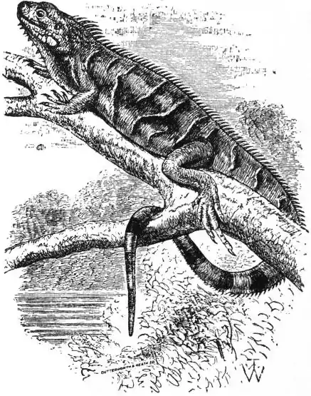One of the largest and most widely distributed is the common iguana (Iguana tuberculata), which occurs in the tropical parts of Central and South America and the West Indies, with the closely allied I. rhinolophus. It attains a length of 6 ft., weighing then perhaps 30 ℔, and is of a greenish colour, occasionally mixed with brown, while the tail is surrounded with alternate rings of those colours. Its food consists of vegetable substances, mostly leaves, which it obtains from the forest trees among whose branches it lives and in the hollows of which it deposits its eggs. These are of an oblong shape about 112 in. in length, and are said by travellers to be very pleasant eating, especially when taken raw, and mixed with farina. They are timid, defenceless animals, depending for safety on the comparative inaccessibility of their arboreal haunts, and their protective colouring, which is rendered even more effective by their remaining still on the approach of danger. But the favourite resorts of the iguana are trees which overhang the