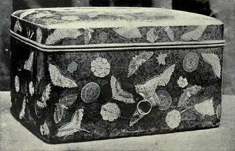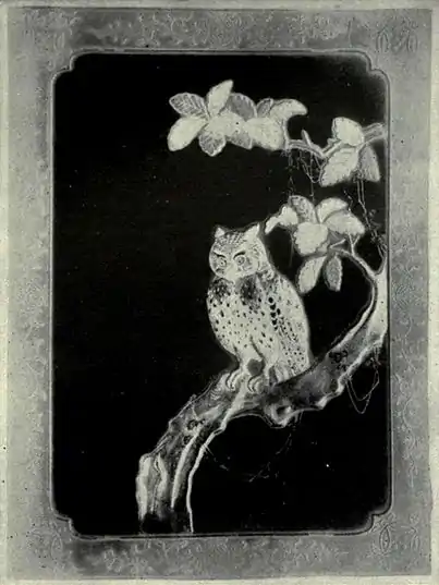 | Fig. 18.—LID OF BOX. By Korin. | Fig. 19.—CASE FOR HEAD OF A SKAKUJO. | Fig. 20.—OWL ON A BRANCH. By Ritsuo. | ||||||