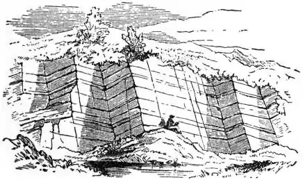 Practical Utility of Joints.—An important feature in the joints of stratified rocks is the direction in which they intersect each other. As the result of observations we learn that they possess two dominant trends, one coincident in a general way with the direction in which the strata are inclined to the horizon, the other running transversely approximately at right angles. The former set is known as dip-joints, because they run with the dip or inclination of the rocks, the latter is termed strike-joints, inasmuch as they conform to the general strike or mean outcrop. It is owing to the existence of this double series of joints that ordinary quarrying operations can be carried on. Large quadrangular blocks can be wedged off that would be shattered if exposed to the risk of blasting. A quarry is usually worked on the dip of the rock, hence strike-joints form clean-cut faces in front of the workmen as they advance. These are known as backs, and the dip-joints which traverse them as cutters. The way in which this double set of joints occurs in a quarry may be seen in the figure, where the parallel lines which traverse the shaded and unshaded faces mark the successive strata. The broad white spaces running along the length of the quarry behind the seated figure are strike-joints or backs, traversed by some highly inclined lines which mark the position of the dip-joints or cutters. The shaded ends looking towards the spectator are cutters from which the rock has been quarried away on one side. In crystalline (igneous) rocks, bedding is absent and very often there is no horizontal jointing to take its place; the joint planes break up the mass more irregularly than in stratified rocks. Granite, for example, is usually traversed by two sets of chief or master-joints cutting each other somewhat obliquely. Their effect is to divide the rock into long quadrangular, rhomboidal, or even polygonal columns. But a third set may often be noticed cutting across the columns, though less continuous and dominant than the others. When these transverse joints are few in number, columns many feet in length can be quarried out entire. Such monoliths have been from early times employed in the construction of obelisks and pillars. (J. A. H.)