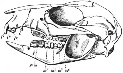 | Fig. 4.—Skull and teeth of Lesueuir’s Rat-Kangaroo (Bettongia lesueuiri). c, upper canine. Other letters as in fig. 3. The anterior premolar has been shed. |
