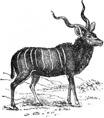 The town of Kuch Behar is situated on the river Tursa, and has a railway station. Pop. (1901), 10,458. It contains a college affiliated to the Calcutta University. KUDU (koodoo), the native name for a large species of African antelope (q.v.), with large corkscrew-like horns in the male, and the body marked with narrow vertical white lines in both sexes. The female is hornless. Strepsiceros capensis (or S. strepsiceros) is the scientific name of the true kudu, which ranges from the Cape to Somaliland; but there is also a much smaller species (S. imberbis) in East and North-East Africa.