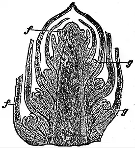 | Fig. 1.—Apex of a shoot showing origin of leaves: f, leaf rudiment; g, rudiment of an axillary bud. |