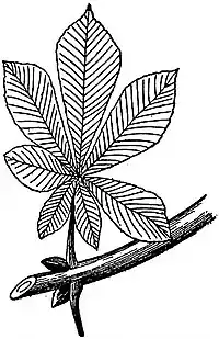 Compound leaves are those in which the divisions extend to the midrib or petiole, and the separated portions become each articulated with it, and receive the name of leaflets. The midrib, or petiole, has thus the appearance of a branch with separate leaves attached to it, but it is considered properly as one Compound leaves. leaf, because in its earliest state it arises from the axis as a single piece, and its subsequent divisions in the form of leaflets are all in one plane. The leaflets are either sessile (fig. 18) or have stalks, called petiolules (fig. 19). Compound leaves are pinnate (fig. 19) or palmate (fig. 18) according to the arrangement of leaflets. When a pinnate leaf ends in a pair of pinnae it is equally or abruptly pinnate (paripinnate); when there is a single terminal leaflet (fig. 19), the leaf is unequally pinnate (imparipinnate); when the leaflets or pinnae are placed alternately on either side of the midrib, and not directly opposite to each other, the leaf is alternately pinnate; and when the pinnae are of different sizes, the leaf is interruptedly pinnate. When the division is carried into the second degree, and the pinnae of a compound leaf are themselves pinnately compound, a bipinnate leaf is formed.