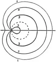 central conic for the focus, and the first positive pedal of a circle for any point. The form of the limaçon depends on the ratio of the two constants; if a be greater than b, the curve lies entirely outside the circle; if a equals b, it is known as a cardioid (q.v.); if a is less than b, the curve has a node within the circle; the particular case when b=2a is known as the trisectrix (q.v.). In the figure (1) is a limaçon, (2) the cardioid, (3) the trisectrix.
