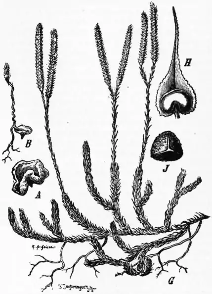 the specialized erect branches bearing the strobile or cones. H, Sporophyte bearing the single sporangium on its upper surface. J, Spore. |