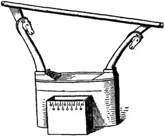 whence chord). They were stretched between the yoke and bridge, or to a tailpiece below the bridge. There were two ways of tuning: one was to fasten the strings to pegs which might be turned (κόλλαβοι, κόλλοπες); the other was to change the place of the string upon the crossbar; probably both expedients were simultaneously employed. It is doubtful whether ἡ χορδοτόνος meant the tuning key or the part of the instrument where the pegs were inserted. The extensions of the arms above the yoke were known as κέρατα, horns.