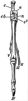 Fig. 6.—Skeleton of Hind Foot of Choeropus castanotis. c, calcanium; a, astralagus; cb, cuboid; n, navicular; c3, ectocuneiform; II. and III. the conjoined second and third digits; IV. the large and only functional digit; V. the rudimentary fifth digit. |