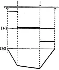 where the arbitrary constants A,B are to be determined by the conditions of the special problem, e.g. the conditions at the ends of the beam. The graph of F is a straight line; that of M is a parabola with vertical axis. In all cases the graphs due to different distributions of load may be superposed. The figure shows the case of a uniform heavy beam supported at its ends.