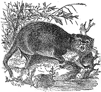 MUSK-RAT, or Musquash, the name of a large North American rat-like rodent mammal, technically known as Fiber zibethicus, and belonging to the mouse-tribe (Muridae). Aquatic in habits, this animal is related to the English water-rat and therefore included in the sub-family Microtinae (see Vole). It is, however, of larger size, the head and body being about 12 in. in length and the tail but little less. It is rather a heavily built animal, with a broad head, no distinct neck, and short limbs, the eyes are small, and the ears project very little beyond the fur. The fore-limbs have four toes and a rudimentary thumb, all with claws; the hind limbs are larger, with five distinct toes, united by short webs at their bases. The tail is laterally compressed, nearly naked, and scaly. The hair much resembles that of a beaver, but is shorter; it consists of a thick soft underfur, interspersed with longer stiff, glistening hairs, which overlie and conceal the former, on the upper surface and sides of the
