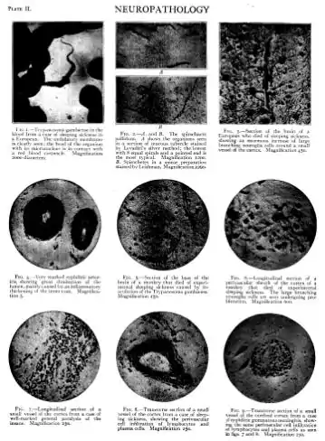 Fig. I.-'I'rypan<>sorna gambicnse in the blood from a case of sleeping sickness in a European. The ilmlulatory membrane is clearly seen; the hcarl of the organism with its micro nucleus is in Contact with a recl blood corpuscle. Magnification 2000 diameters. FIG. 4.-Very marked syphilitic arterit is, showing great diminution of the lumen, mainly caused by an inflammatory thickening of the inner coat. Magnilication 5. FIG. 7.-Longitudinal section of a small vessel of the cortex from a case of well-marked general paralysis of the insane. Magnification 250. B FIG, 2.-/1. and B. The spirochaete pallirlum. A shows the organisms seen in a section of mucous tubercle stained by Leva<liti's silver method; the lowest with 8 equal spirals and a pointed end is the most typical. Magnification moo. B. Spirochetcs in a smear preparation stained by Leishman. Magnification 2260-FIG. 5.-Section of the base of the brain of a monkey that died of experimental sleeping sickness caused by inoculation of the Trypanosoma gambiense. Magnification 250. FIG. 8.-Transverse section of a small vessel of the cortex from a case of sleeping sickness, showing the perivascular cell infiltration of lymphocytes and plasma cells. Magnification 250. FIG. 3.-Section of the brain of a European who died of sleeping sickness, showing an enormous increase of large branching neuroglia cells around a small vessel of the cortex. Magniiication 450. FIG. 6.-Longitudinal section of a perivascular sheath of the cortex of a monkey that died of experimental sleeping sickness. The lar e branching neuroglia cells are seen untiergoing pro life ration. Magnification 600. FIG. 9.-Transverse section of a small vessel of the cerebral cortex from a case of syphilitic gummatous meningitis, show ing the same perivascular cell infiltration of lymphocytes and plasma cells as seen