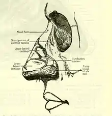 The bony framework of the nose is part of the skull iq.v.), but the outer nose is only supported by bone above; lower down its shape is kept by an " upper " and " lower lateral cartilage " and two or three smaller plates known as " cartilagines minores."
