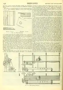 The wire after being manufactured is made up into hanks for storage purposes; but when required for gun construction it is thoroughly cleaned and wound on a drum R about 3 ft. 6 in. in diameter, which is placed in one portion of the machine in connexion, with a powerful band friction brake M. The wire is then led to the gun A placed between centres or on rollers B.B. parallel to the axis of the wire drum. By rotating the gun the wire is drawn off from the drum against the resistance of the band brake, which is so designed that, by adjusting the weight S suspended from the brake strap, any desired resistance can be given in order to produce the necessar>tension in the wire as it is being wound on the gun. The stress on