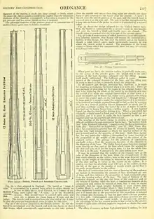 Over the muzzle end two or three long tubes are shrunk; the chase hoop is also screwed to the barrel near the muzzle. A jacket is shrunk over the breech portion of the gun, and the breech bush is screwed into it at the rear end. The gun is further strengthened by a long tube in front of the jacket to which it is attached by a screwed collar.