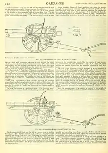 The American Q.F. Field Gun. — This is an example of the Ehrhardt type of gun. It is considerably more powerful than the field guns adopted by most European powers. Steadiness is ensured by making the trail 10* ft. long, or l ft. longer than the Krupp trail. The construction is otherwise very similar to that of the Krupp gun shown in fig. 64, Plate IV. Four rounds are carried in tubes on the carriage.