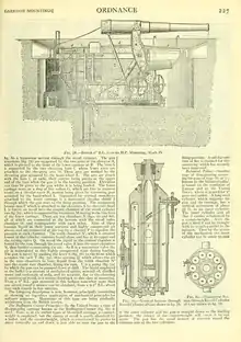 in the outer cylinder and the gun is brought down to the loading position; the release of the counterweight will cause it to again. The gun has the usual motion common axis of the two cylinders.