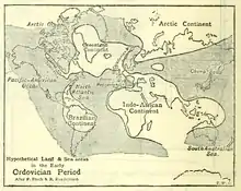 Distribution. — The Ordovician system is widely distributed. The accompanying map indicates roughly the relative positions of the principal land-masses and seas, but it must be accepted with reserve.