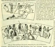 nor yet arranged in formal rows one above the other, but distributed at different levels on the one plane of the picture, the levels being distinguished by summary indications of a landscape setting. Parts of some of the figures were hidden by risings of the ground. The general effect is probably represented by the paintings on the vase in the Louvre shown in fig 4, one side of which exhibits the destruction of the children of Niobe, and the other the Argonauts. SimpHcity in design and ethical dignity in the single forms are here unmistakable.