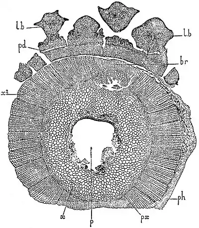 The anatomy of Lepidodendron and its immediate allies is now well known in a number of species; the Carboniferous rocks of Great Britain are especially rich in petrified specimens, which formed the subject of Williamson's extensive investigations. The stem is in all cases monostelic; in most of the forms the central cylinder underwent secondary growth, and the distinction between primary and secondary wood is very sharply marked. In L. Harcourtii, however, the species earliest investigated (by Witham, 1833, and Brongniart, 1837), and in one or two other species, no secondary wood has yet been found. The primary wood of Lepidodendron forms a continuous cylinder, not broken up into distinct bundles; its development was clearly centripetal, the spiral elements forming more or less prominent peripheral groups. In the larger stems of most species there was a central pith, but in certain of the smaller branches, and throughout the stem in some species (L. rhodumnense, L. selaginoides), the wood was solid. A single leaf-trace, usually collateral in structure, passed out into each leaf. The primary structure of the stem was thus of a simple Lycopodiaceous type, resembling on a larger scale what we find in the upright stem of Selaginella spinosa. In most species (e.g. L. selaginoides, L. Wunschianum, L. Veltheimianum) secondary growth in thickness took place, and secondary wood was added, in the centrifugal direction, showing a regular radial arrangement, with medullary rays between the series of tracheides (fig. 9). The tissue thus formed often attained a considerable thickness. While