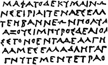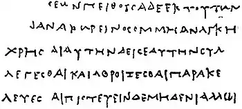 The general breadth of the square letters, the smallness of the letters composed of circles and loops, and the particular formation of such letters as pi and the clipped omega, are repeated. But the approach also of many of the letters to the lapidary capital forms, like those in the papyrus of Timotheus, is to be remarked, such as the precisely shaped alpha, and the epsilon in many instances made square with a long head-stroke. This mixture of forms seems to indicate an advance in the development of the book-hand of the 3rd century B.C., as contrasted with the archaic style of the older Timotheus.