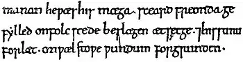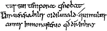 The course of the progressive changes in the pointed hand may be followed in the Facsimiles of Ancient Charters in the British Museum and in the Facsimiles of Anglo-Saxon MSS. of the Rolls Series. The charters reproduced in these works have survived in sufficient numbers to enable us not only to form a fairly accurate knowledge of the criteria of their age, but also to recognize local peculiarities of writing. The Mercian scribes appear to have been very excellent penmen, writing a very graceful hand with much delicate play in the strokes. On the other hand the writing of Wessex was heavier and more straggling and is in such strong contrast to the Mercian hand that its examples may be easily detected with a little practice. Turning to books in which the pointed hand was employed, a very beautiful specimen, of the 8th century, is a copy of Bede's Ecclesiastical History (fig. 42) in the University Library at Cambridge (Pal. Soc. pls. 139, 140), which has in a marked degree that breadth of style which has been referred to. Not much later is another copy of the same work in the Cottonian Library (Pal. Soc. pl. 141; Cat. Anc. MSS. pt. ii., pl. 19), from which the following facsimile is taken.