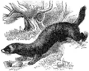 The black-footed or American polecat (Putorius nigripes) is a native of the central plateau of the United States, and extends southwards into Texas. It is often called the prairie-dog hunter, as it is nearly always found in the warrens of that animal. The fur is cream-yellow, the legs are brown, and the feet and tail-tip black.