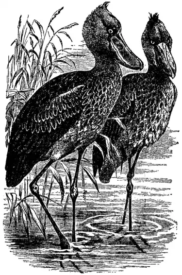SHOE-BILL, a huge African bird from the White Nile, the Balaeniceps rex of ornithology, now regarded as a giant heron. It was first brought to Europe by M. Parkyns and described by J. Gould in the Zoological Proceedings (1851, pp. 1, 2, pl. xxxv.) as an abnormal pelican. This view was disputed by Reinhardt (op. cit. 1860, p. 377), and wholly dispelled by W. K. Parker in the Zoological Transactions (iv. pp. 269-351), though these two authors disagreed as to its affinities, the first placing it with the storks, the last assigning it to the herons. In singularity of aspect few birds surpass Balaeniceps, with its gaunt grey figure, some 5 ft. in height, its large head surmounted by a little curled tuft, the scowling expression of its eyes and its huge bill in form