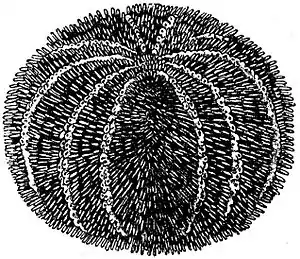 | Fig. 1.—A Regular Sea-urchin, Echinus esculentus. The test is still covered with spines, the suckers of the podia are seen in ten rows. |