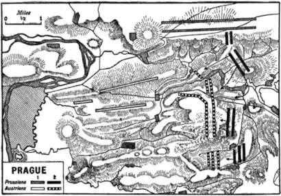 Bevern in Silesia, who had been beaten at Moys near Gorlitz (September 7th) and in the battle of Breslau on the 22nd of October, had been compelled to retire behind the Oder, leaving the fortresses of Schweidnitz and Breslau to their fate, and both had capitulated within a few days. Leaving a small reinforcement for Ferdinand, the king now moved by forced marches to Liegnitz. The distance, about 170 m. through difficult country, was covered again in 12 days, but the numbers were small, only 13,000, which shows how tremendous had been the drain upon the men of the previous six weeks’ exertions. On the night of the 4th of December, having joined the beaten forces of Bevern at Parschwitz, making in all 43,000 men of very unequal fighting value, he decided to attack the 72,000 Austrians who lay across the Breslau road, their centre marked by the village of Leuthen (q.v.). His position appeared so