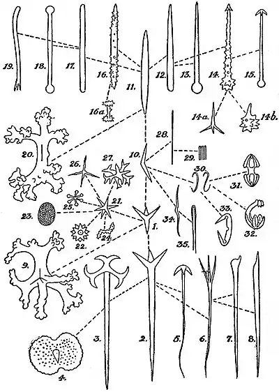 The tetracrepid desma (fig. 29, 9), characteristic of many Lithistids, has been derived from the primitive tetract by ramification of the ends of all the rays.