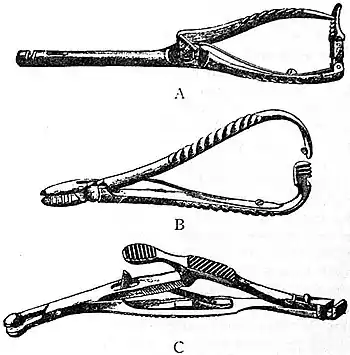 The employment of radium in surgery is still in its infancy. Doubtless radium is a very powerful agent, but even if it were Radium. found of peculiar value in treatment its cost would, for the present, put it out of the reach of most practitioners. Probably it will be found useful in the treatment of naevus, rodent ulcers and superficial malignant growths. As to what influence radium may have in the treatment of deeply-seated cancers it is as yet impossible even to guess. For those sad cases, however, which the practical surgeon is reluctantly compelled to admit as being beyond the reach of his operative skill, the influence of radium should be tried with determination and thoroughness. The therapeutic influence of radium may eventually be found to be great, or it may be disappointing. The fact that under direct royal patronage an institution has been established in London for the investigation of the physical and therapeutic value of this newly discovered agent should satisfy every one that its properties will be duly inquired into and made known without mystery or charlatanism and absolutely in the interest of the people. But in the meanwhile too much must not be expected from it as a surgical agent. (E. O.*) SURGICAL INSTRUMENTS AND APPLIANCES. The purpose of this article is to give an account of the more important surgical instruments that are now in general use, and to show by what modifications, and from what discoveries in science, the present methods of an operation have come to be what they are. The good surgeon is careful to use the right sort and pattern of instrument, and the chief fact about the surgery of the present day, that it is aseptic or antiseptic, is recorded in the make of surgical instruments and in all the installation of an operating-theatre. Take, for instance, a scalpel and a saw that are figured in Ambroise Paré's (1510-1590) surgical writings. The scalpel folds into a handle like an ordinary pocket-knife, which alone was enough in those days to keep it from being aseptic. The handle is most elegantly adorned with a little winged female figure, but it does not commend itself as likely to be surgically clean. The saw, after the same fashion, has a richly chased metal frame, and, at the end of the handle, a lion's head in bold relief, with a ring through its mouth to hang it up by. It may be admirable art, but it would harbour all sorts of germs. If one contrasts with these artistic weapons the instruments of 1850, one finds no such adornment, and for general finish Savigny's instruments would be hard to beat; but the wooden or ivory handles, cut with finely scored lines like the cross-hatching of an engraving, are not more likely to be aseptic than the handles of Paré's instruments. At the present time, instead of such handles as these, with blades riveted into them, scalpels are forged out of one piece of steel, their handles are nickel-plated and perfectly smooth, that they may afford no crevices, and may be boiled and immersed in carbolic lotion without tarnishing or rusting; the scalpel has become just a single, smooth, plain piece of metal, having this one purpose that it shall make an aseptic wound. In the same way the saw is made in one piece, if this be possible; anyhow, it must be, so far as possible, a simple, smooth, unrusting metal instrument, that can be boiled and laid in lotion; it is a foreign body that must be introduced into tissues susceptible of infection, and it must not carry infection with it.