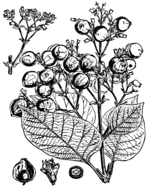 During the dry season the tree is leafless; in hot localities the leaves fall in January, but in moist places the tree remains green till March. At the end of the dry season, when the first monsoon rains fall, the fresh foliage comes out. The leaves, which stand opposite, or only whorled in very young specimens, are from 1 to 2 ft. in length and from 6 to 12 in. in breadth. On coppice shoots the leaves are much larger, and not rarely from 2 to 3 ft. long. In shape they somewhat resemble those of the tobacco plant, but their substance is hard and the surface rough. The small white Bowers are very numerous, on large erect cross-branched panicles, which terminate the branches. They appear during the rains, generally in July and August, and the seed ripens in the succeeding January and February. On the east side of the Indian peninsula, the teak Bowers during the rains in October and November. In Java the plantations are leafless in September, while during March and April, after the rains have commenced, they are clothed with foliage and the flowers open. During the rainy season the tree is readily recognized at a considerable distance by the whitish Bower panicles, which overtop the green foliage, and during the dry season the feathery seed-bearing panicles distinguish it from its associates. The small oily seeds are enclosed in a hard, bony, 1–4-celled nut, which is surrounded by a thick covering, consisting of a dense felt of matted hairs. The fruit thus formed is further enclosed in the enlarged membranous calyx, in appearance like an irregularly plaited or crumpled bladder. The tree seeds freely every year, but its spread by means of self-sown seed is impeded by the forest fires of the dry season, which in India generally occur in March and April, after the seeds have ripened and have partly fallen. Of the seeds which escape, numbers are washed down the hills by the first heavy rains of the monsoon. These collect in the valleys, and it is here that groups of seedlings and young trees are frequently found. A portion of the seed remains on the tree; this falls gradually after the rains have commenced, and thus escapes the fires of the hot season. The germination of the seed is slow and uncertain; a large amount of moisture is needed to saturate the spongy covering; many seeds do not germinate until the second or third year, and many do not germinate at all. Where the teak tree is associated with dense clumps of bamboo, natural reproduction is almost absent, except when the bamboo flowers and dies, and even then, if the dry bamboos and the resultant bamboo seedlings are not burnt, such young teak as may germinate are likely to be smothered at once.