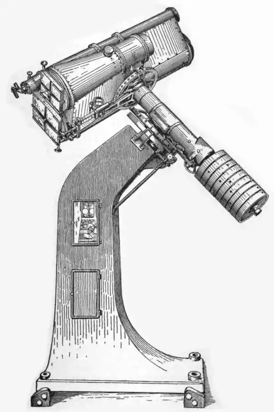 Type D.—The first important equatorial of type D was the 4-ft. effecting telescope of Lassell (Mem. R.A.S., xxxvi. 1–4), and later Lord Rosse’s 36-in. reflecting telescope at Birr Castle (Phil. Trans., clxxi. 153), and A. Common’s 36-in. reflecting telescope mounted by him at Ealing (Mem. R.A.S., xlvi. 173–182). In Lassell’s instrument (a reflector of the Newtonian type) the observer is mounted in the open air on a supplementary tower capable of motion in any azimuth about the centre of motion of the telescope, whilst an observing platform can be raised and lowered on the side of the tower. In Lord Rosse’s instrument (also of the Newtonian type) the observer is suspended in a cage near the eye-piece, and the instrument is used in the open air. Common’s telescope presents many ingenious features, especially the relief-friction by flotation of the polar axis in mercury, and the arrangements of the observatory for giving ready access to the eye-piece of the telescope.