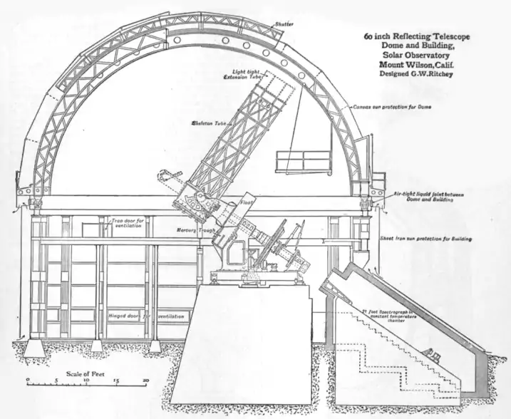 mirror, which returns the rays towards the centre of the large mirror and causes them to converge less rapidly. They then meet a small plane mirror supported at the point of intersection of the polar and declination axes, whence they are reflected down through the hollow polar axis as shown in fig. 2, and come to focus on the slit of the powerful spectroscope that is mounted on a pier in the chamber of constant temperature as shown in fig. 20. In this case the equivalent focal length is 150 ft.