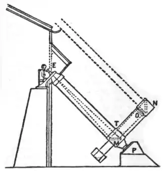 Type E.—In the Comptes Rendus for the year 1883, vol. 96, pp. 735-741, Loewy gives an account of an instrument which he calls an “equatorial coudé, " designed (1) to attain greater stability and so to measure larger angles than is generally possible with the ordinary equatorial; (2) toLowey’s equatorial coudé. enable a single astronomer to point the telescope and make observations in any part of the sky without changing his position; (5) to abolish the usual expensive dome, and to stibstitute a covered shed on wheels (which can be run back at pleasure), leaving the telescope in the open air, the observer alone being sheltered. These 'conditions are fulfilled in the manner shown in fig. 22. E P is the polar axis, rotating on bearings at E and P. The object-glass is at O, the eye-piece at E. There is a plane mirror at M, which reflects rays converging from the object-glass to the eye-piece at E. A second mirror N, placed at 45° to the optical axis of the object-glass, reflects rays from a star at the pole; but by rotating the box which contains this mirror on the axis of its supporting tube T a star of any declination can be observed, and by combining this motion with rotation of the polar axis the astronomer seated at E is able to view any object whatever in the visible heavens, except circumpolar stars near lower transit. An hour circle attached to E P and a declination circle attached to the box containing the mirror N, both of which can be read or set from E, complete the essentials of the instrument.