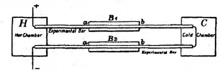 16. Absolute Measurement of Thomson Effect.-Another method of verifying Tait’s hypothesis, of greater difficulty but of considerable interest, is to measure the absolute value of the heat absorbed by the Thomson effect, and to observe whether or not it varies with the temperature. Le Roux (Ann. Chim. Phys., x. p. 201, 1867) made a number of relative measurements of the effect in different metals, which agreed qualitatively with observations of the thermoelectric power, and showed that the effect was proportional to the current for a given temperature gradient. Batelli has applied the same method (Accad. Sci. Turin, 1886) to the absolute measurement. He observed with a thermocouple the difference of temperature (about .01° C.) produced by the Thomson effect in twenty minutes between two mercury calorimeters, B1 and B2, surrounding the central portions of a pair of rods arranged as in Le Roux’s method (see fig. 3). The value of the Thomson effect was calculated by multiplying this difference of temperature by the thermal capacity of either calorimeter, and dividing by the current, by they number of seconds in twenty minutes, and by twice the difference of temperature (about 20°) between the ends a and b of either calorimeter. The method appears to be open to the objection that, the difference of temperature reached in so long an interval would be more or less independent of the thermal