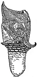 (“Challenger” Reports, “Cirripedia,” 1883, viii. 8-11), gives a brief geological summary down to 1882. In that year J. M. Clarke (Amer. Journ. Sci. and Arts, 3rd series, vol. xxiv., p. 55) added a new species to Plumulites (Barrande, 1872), remarking that the species in question, P. devonicus, “is interesting in being the first representative of fossil barnacles from the Devonian, Barrande's species of Plumulites and Anatifopsis, as well as the Turrilepis of Woodward, being from the Upper and Lower Silurian, and Plumulites jamesi (Hall and Whitf., Pal. Ohio, vol. ii.) from the Hudson River group.” Since Plumulites appears to be a synonym of Turrilepas (not Turrilepis), the species Turrilepas wrightii (Woodward, 1865), from the Upper Silurian of Dudley, did not long enjoy an isolated eminence as the oldest known cirripede. As pointed out by Dr Bather (Geol. Mag. 1901, decade 4, vol. viii. p. 521), palaeontologists themselves have in this branch not very closely followed the progress of their own science, since Dr Ruedemann, in regard to his new Pollicipes siluricus, 1901, speaks of “the enormous gap existing between the appearance of this Lower Siluric type and the next Upper Triassic (Rhaetic) representatives of the genera Pollicipes and Scalpellum.” Many species of Scalpellum from the Wenlock shale of Gotland were described in 1892 by C. W. S. Aurivillius, who at the same time founded the species Pollicipes signatus on an almost perfect specimen from the Lower Ludlow of Wisby in Sweden. Aurivillius considered that Pollicipes signatus showed a closer approach to the Balanidae than any other of the Lepadidae, but he, too, in ignorance of the Devonian Protobalanus (Whitf.), discoursed needlessly about the gap in the distribution. Dr Bather justifiably anticipates further discoveries, but if, already in Silurian as in modern times, the members of these families had to pass through nauplius and cypris stages to maturity, there is one “enormous gap” between them and the common ancestor of the crustacean class that will not be easily filled. To later phylogenetic links an addition is offered by Dr Woodward (Geol. Mag., 1901, p. 145), who transfers his Pyrgoma cretaceum, 1865, to a new genus Brachylepas (fig. 1), and a new family Brachylepadidae, intermediate between the Rhaetic Pollicipes and the modern Balanus. Among other fossil genera of recent institution, Archaeolepas, Lepidocoleus, Squama, Stramentum can only be mentioned as incentives to research. Among living forms, added since Weltner's catalogue, may be noticed Koleolepas willeyi, from the Loyalty Islands (Stebbing, in Wil1ey's Zool. Results (1900) pt. v., p. 677. This was found in a Turbo shell, occupied also by a Pagurid, and coated with Actinians. The cirripede, which has an elastic peduncle, a crested capitulum, but no valves, and the first cirrhi longer than the rest, should stand near Eremolepos, the name given by Weltner in place of the preoccupied Gymnolepas (Aurivillius). In the genus Scalpellum, S. giganteum, Gruvel (Trans. Linn. Soc., 1901) disputes with S. stearnsii (fig. 2), Pilsbury, 1890, which shall be accounted the greater. The latter is threatened with a new generic name (Chun, Aus den Tiefen des Weltmeeres, 1900, p. 502).