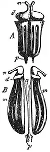 Fig. 3.—A, Pistil; B, Fruit of the Caraway (Carum Carui); enlarged. d, epigynous disk; f, ovary; n, stigma; p, pedicel. In B the two carpels have separated so as to form two mericarps (m). Part of the septum constitutes the carpophore (a). |
