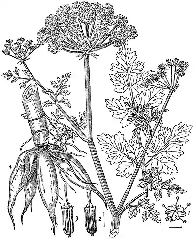 The order is divided into 9 tribes depending on the form of the fruit, whether compressed, angled, grooved, constricted, &c., and the presence or absence of vittae. The 35 British genera include representatives of 7 of the tribes. The following may be mentioned: Hydrocotyle (pennywort), Eryngium (sea-holly), Sanicula (sanicle), Conium (hemlock, q.v.), Smyrnium (Alexanders), Bupleurum (hare's-ear), Apium (celery, q.v.), Carum (caraway, q.v.), Conopodium or Bunium (earth-nut, q.v.), Myrrhis (Cicely), Chaerophyllum (chervil), Foeniculum (fennel, q.v.), Crithmum (samphire), Oenanthe (water dropwort), Aethusa (fool's parsley, q.v.), Angelica (q.v.), Peucedanum (hog's fennel, parsnip, q.v.), Heracleum (hogweed), Daucus (carrot). Petroselinum sativum is common parsley (q.v.).