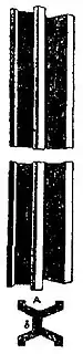 Iridio-platinum bar of Tresca section as shown at A. The two microscopic lines are engraved on the measuring axis of the bar at b, one near to each end of the bar. The standard metre (mètre à-traits) was supplemented by the delivery to Great Britain, in 1898, of an end standard metre (metre à bouts) also made of iridio-platinum, and also verified by the C.I.P.M. A comparison of the yard with the metre was made by the C.I.P.M. in 1896, and of the pound and and kilogram in 1883–1885 (see III. Commercial). |