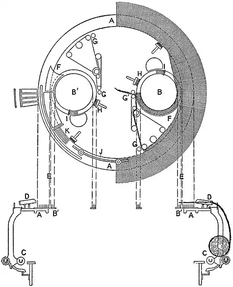 A, A is the large comb circle and B, B′ the two small comb circles. The slivers are delivered by the mechanism C to the feed boxes D, being thrown across the pins of the large and small circles at position E. A stroke at F suitably directs the fringes of fibre as the circles separate and the combed fibres are taken hold of by drawing-off rollers G and G′ and combined to form the “top.” The brushes H, H and the noil knives I clear the small circles of the “noil.” The feed knife J in conjunction with the inclined planes at K are instrumental in feeding a previously directed length of sliver over the two circles as they practically touch one another at the point E, and so the process is continued.