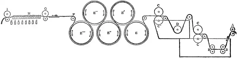 A are the delivering rollers, B, B are the immersing rollers in the first tank, C, C are the press rollers to squeeze out superfluous liquors, D is the immersing roller in the second tank, and C′, C′ are the press rollers for the second tank. Drying cylinders E to E″″ may be arranged as “live-heat” cylinders, as secondary heated cylinders or as air drying cylinders. The roller F directs the slivers into the back rollers G of the gill-box, which in turn delivers up the slivers to the fallers H, which in turn delivers the wool to the front rollers I.