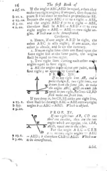 1. Hence, if one angle A B D be right, the other ABC is alſo right; if one acute, the other is obtuſe, and ſo on the contrary. 2. If more right lines than one ſtand upon the ſame right line at the ſame point, the angles {{lsh}all be equal to two right. 3. Two right lines cutting each other make angles equal to four right. 4. All the angles made about one point, make four right; as appears by Coroll. 3.
